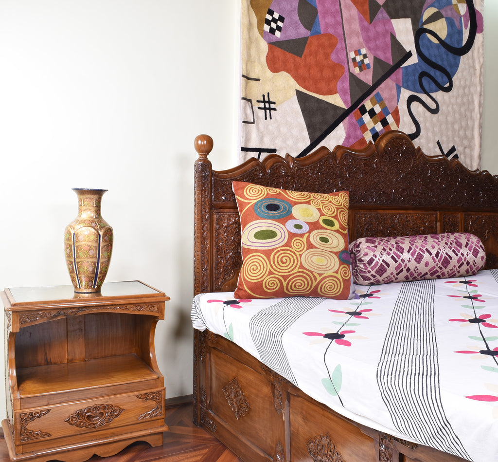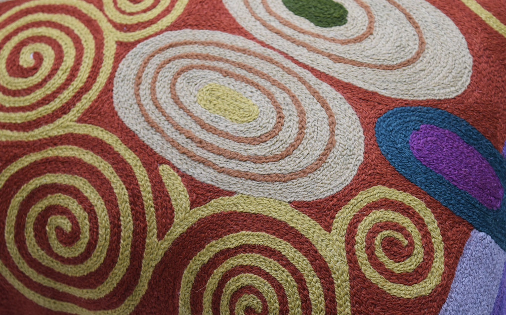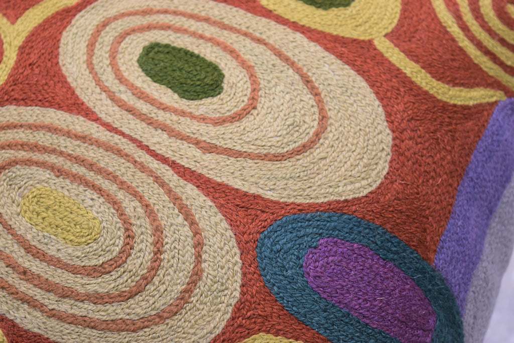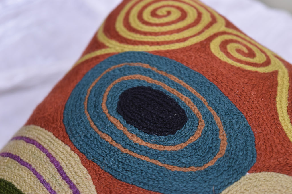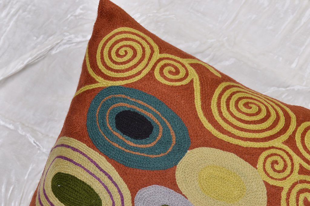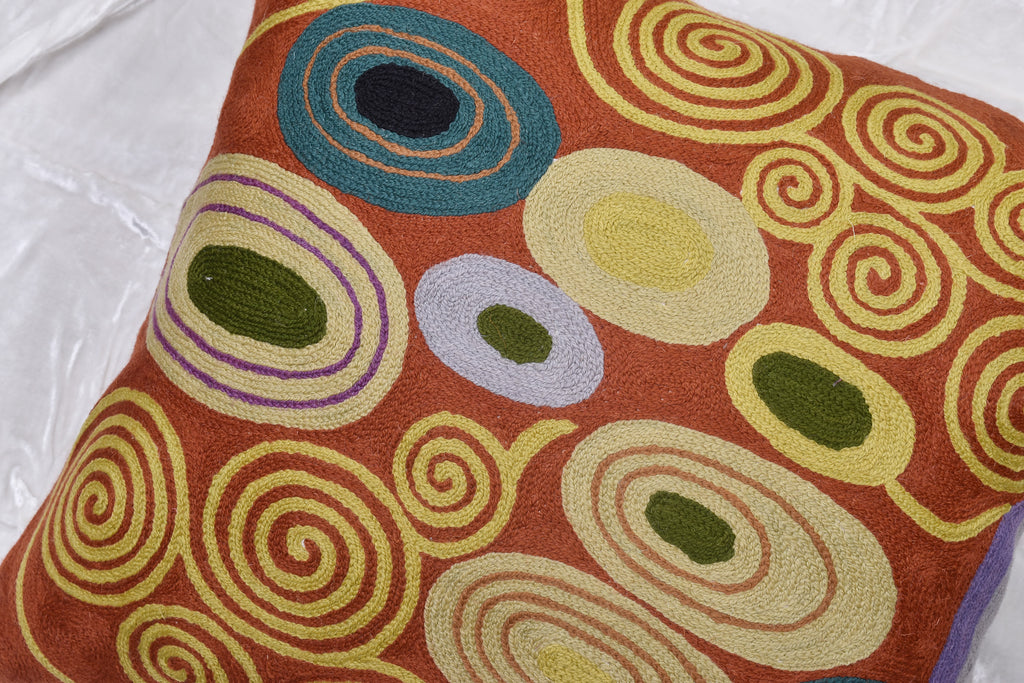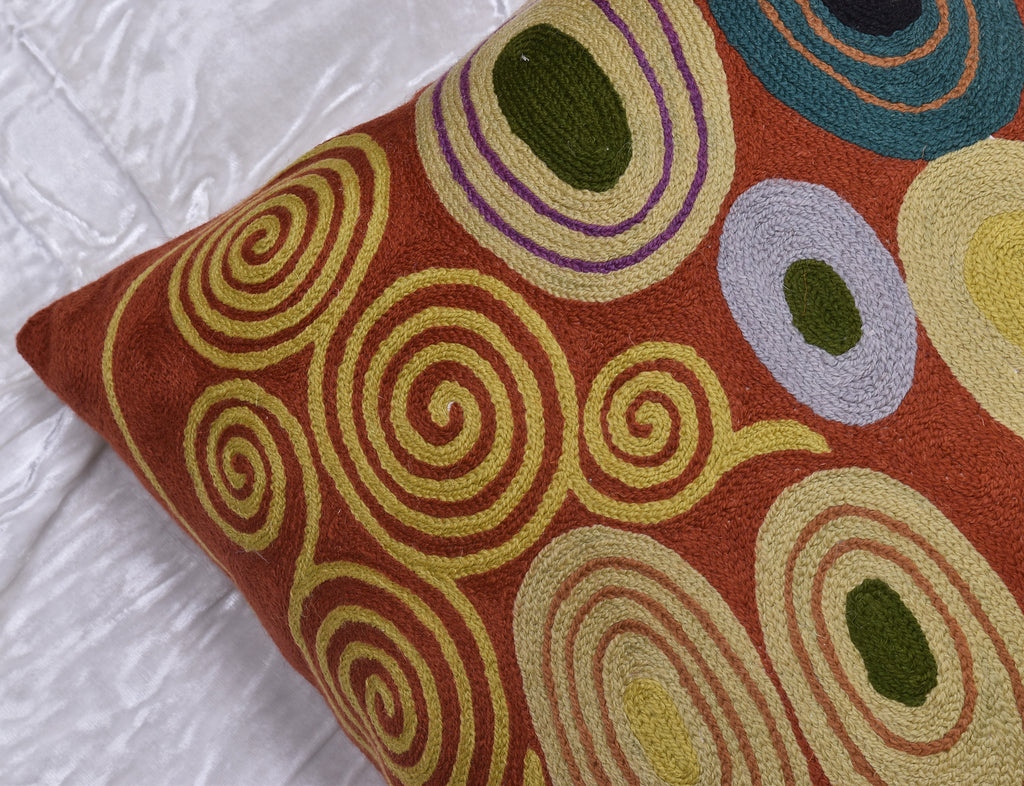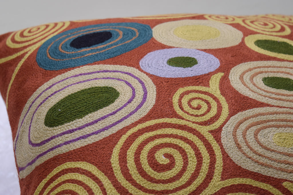 A close-up view of this abstract pillow cover allows you to see the amazing chain-stitch embroidery work of master artisans who have practiced this art their entire lives.This abstract decorative pillow cover could grace the cabin of your boat or the chair in your solarium and yet be equally as comfortable in your den.