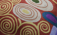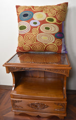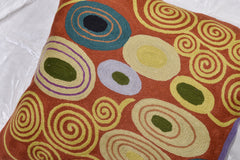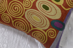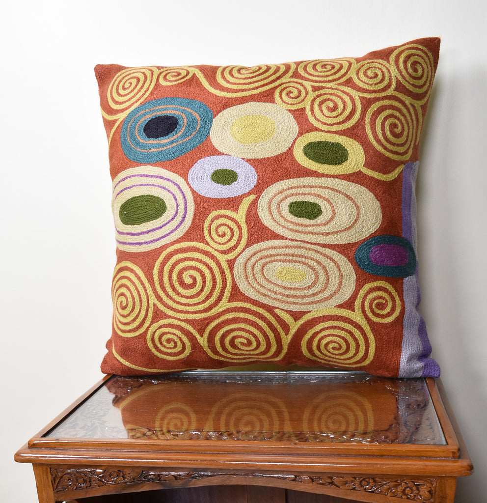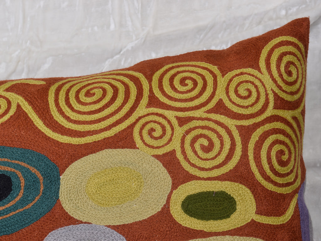 Klimt Coral Swirls Accent Pillow Cover- The Tree of Life branching up to the night sky with and its roots in the earth. Using elements of Klimt, yet quite possibly also inspired by Van Gogh's 'The Starry Night,' this piece offers a dramatic accent to any room. The entire cotton base of the pillow is overlaid with soft wool, stitch by stitch, creating an extraordinary show piece for your decor. This is world-class workmanship created to enhance your world with dynamic color and motif.