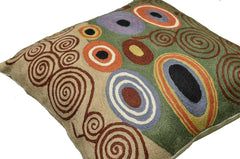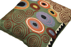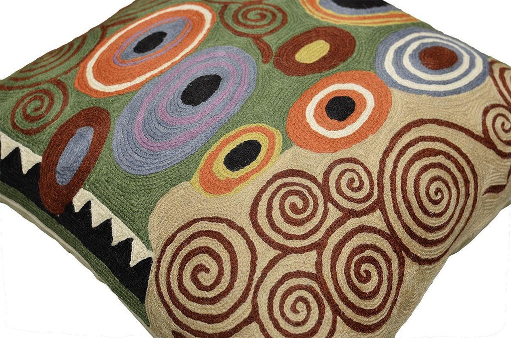 Klimt Green Swirls Decorative Pillow Cover Wool hand embroidered - The motif in this modern pillow cover brings to mind not only Klimt's famous 'Tree of Life' painting, but also Kandinsky's colorful concentric circles. A delightful depiction of abstract modern art, this pillow cover design is chain stitched with soft Kashmiri wool thread into a meta-motif of the soul approaching the tree of life. Since the 15th century, Kashmiri artisans have produced the finest chain stitch crewel work in the world including modern abstract pillows. This festive cushion cover belongs in your home, defining your decor.