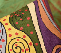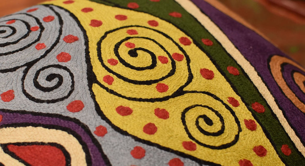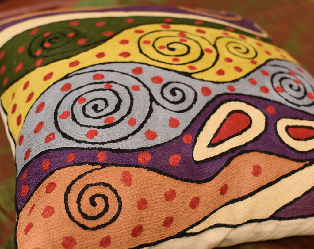 A close-up view of this abstract pillow cover allows you to see the amazing chain-stitch embroidery work of master artisans who have practiced this art their entire lives.This abstract decorative pillow cover could grace the cabin of your boat or the chair in your solarium and yet be equally as comfortable in your den.