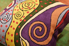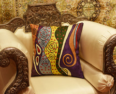 This Klimt inspired purple pillow cover depicts the Tree of Life design branching up to the night sky with and its roots in the earth. Using elements of Klimt, yet quite possibly also inspired by Van Gogh's ‚The Starry Night, this piece offers a dramatic accent to any room. The entire cotton base of the pillow is overlaid with soft wool, stitch by stitch, creating an extraordinary showpiece for your decor. This is world-class workmanship created to enhance your world with dynamic colors and motif.