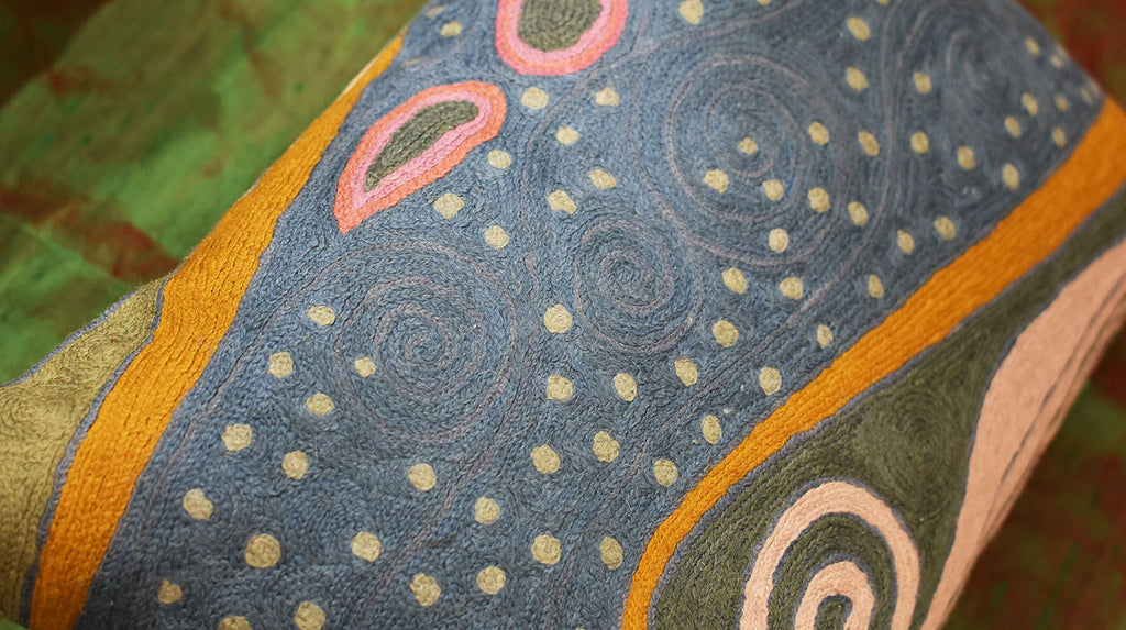 A close-up view of this abstract pillow cover allows you to see the amazing chain-stitch embroidery work of master artisans who have practiced this art their entire lives.This abstract decorative pillow cover could grace the cabin of your boat or the chair in your solarium and yet be equally as comfortable in your den.
