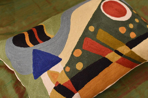 Lumbar Kandinsky Throw Pillow Composition VII Green Hand Embroidered Wool 14x20"
