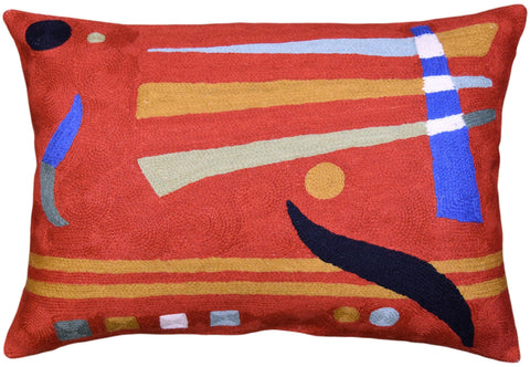 A close-up view of this abstract pillow cover allows you to see the amazing chain-stitch embroidery work of master artisans who have practiced this art their entire lives.This abstract decorative pillow cover could grace the cabin of your boat or the chair in your solarium and yet be equally as comfortable in your den. The eye-popping color and pattern of this modern throw pillow is just what the designer ordered to create a fiery focal point in your decor. Perfect wherever you need a splash of color, this art work pillow creation is as durable as it is beautiful. Easy to care for, this cushion cover could spark up an old throw pillow or grace a new pillow form. Kandinsky conveyed profound spirituality and inner human emotion through a visual language of abstract forms and colors that transcended cultural and physical boundaries. He used interrelation between color and form to create an aesthetic experience that engaged the sight, sound, and emotions of the viewer. Kandinsky viewed music as the most transcendent form of non-objective art musicians could evoke images in listeners‚ minds merely with sounds. He crafted spiritually rich paintings that alluded to sounds and emotions through sensations. Modern Artist Wassily Kandinsky used the form of concentric circles to portray the soul. Rendered here as chain stitch embroidery in art silk, this cushion cover can create a new personality for any room in which you choose to use it.