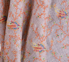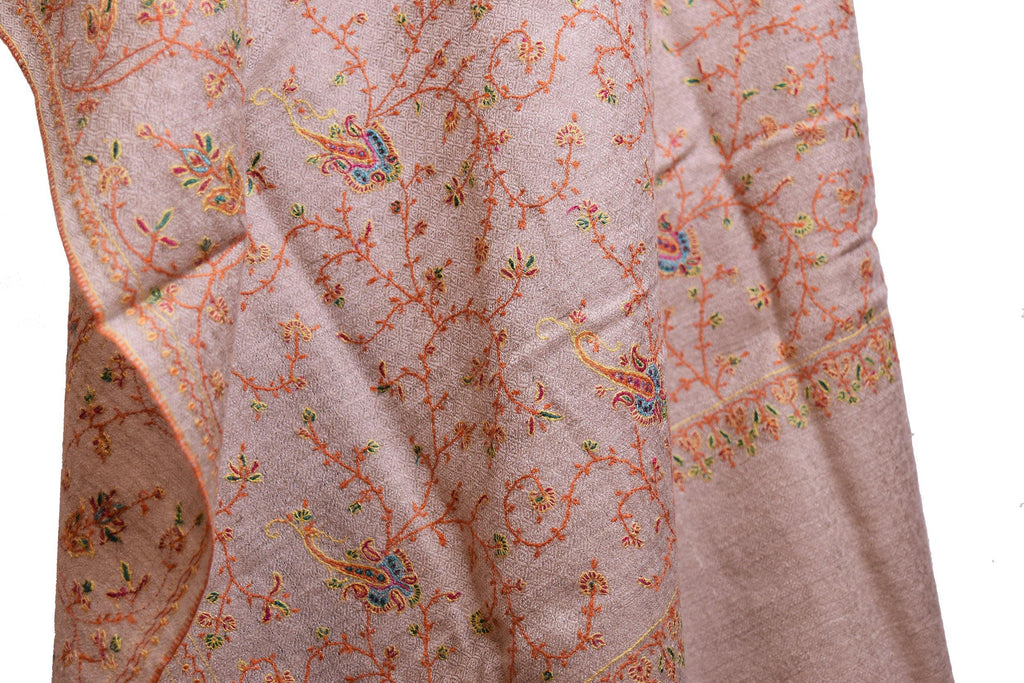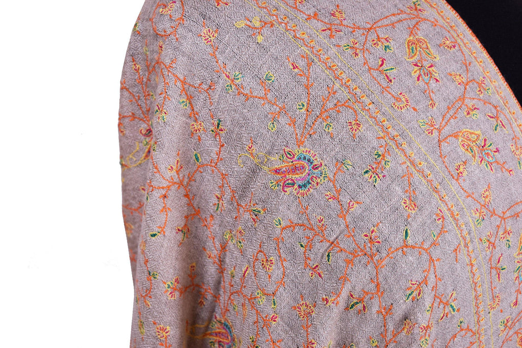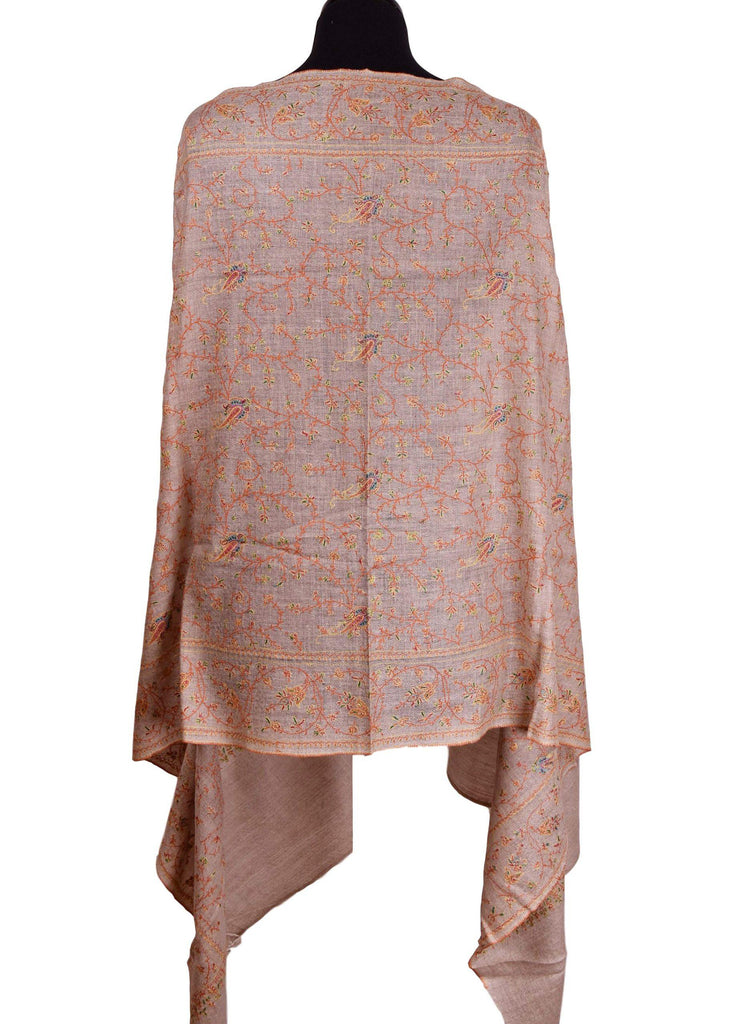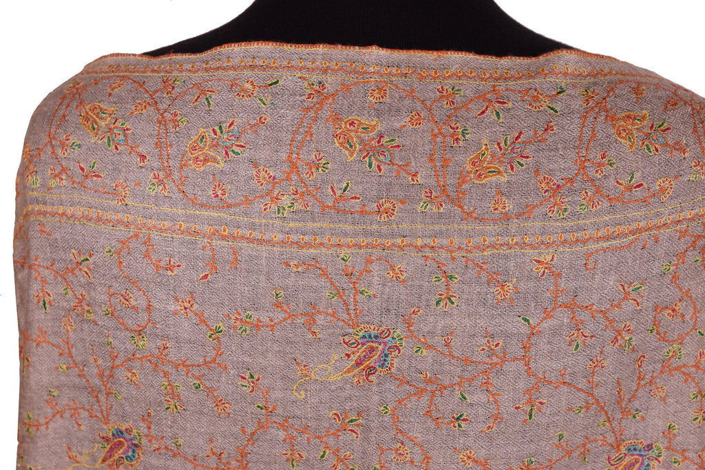 Opulence and mystique are the hallmarks of a hand embroidered Kashmir shawls. The elegance of this beautiful natural color shawl is an epitome of class displayed by the lustrous natural sheen of silk hand embroidery.