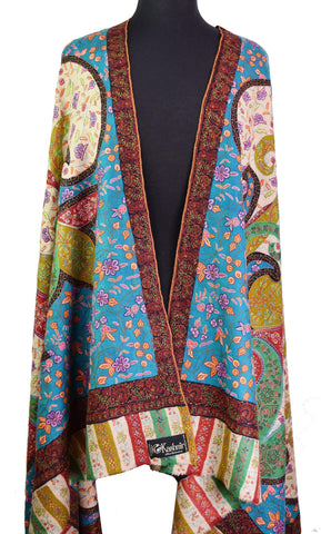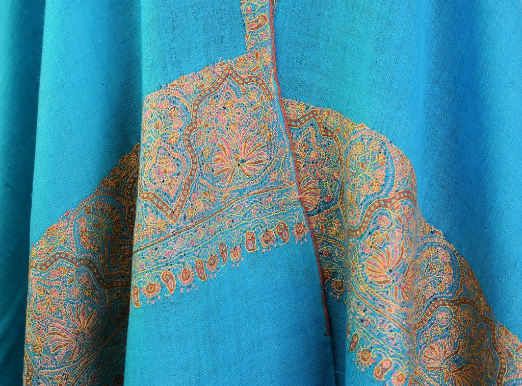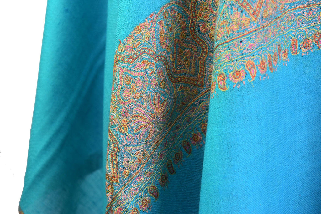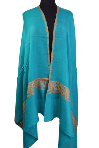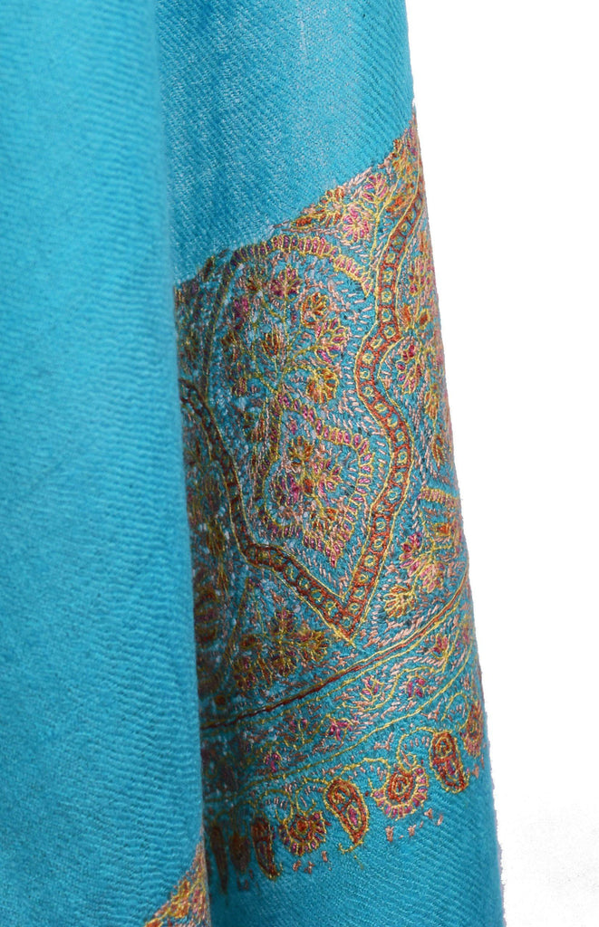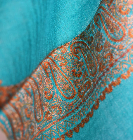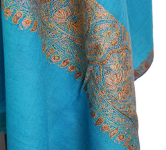 Opulence and mystique are the hallmarks of a hand embroidered Kashmir shawls. The elegance of this beautiful Turquoise shawl is an epitome of class displayed by the lustrous natural sheen of silk hand embroidery.