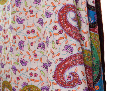 There is nothing else on earth like a hand-embroidered shawl - it's an intense work because the embroidery design covers the entire base fabric. All over full design hand-embroidered shawls take at least 6-12 months to create and only the finest artisans attempt such a feat; they can only create one or two shawls in a year. Not only their art, but their very being goes into its creation.