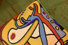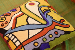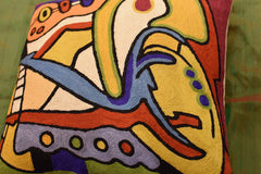A close-up view of this abstract pillow cover allows you to see the amazing chain-stitch embroidery work of master artisans who have practiced this art their entire lives.Chain stitch embroidery on a cotton base produces a soft, fine crewel, and the stitches create definite swirls as distinct as your fingerprint. Kashmiri craftsmen produce the finest quality chain stitch needlework in the world. This abstract decorative pillow cover could grace the cabin of your boat or the chair in your solarium and yet be equally as comfortable in your den. Durable and easy to clean, this toss pillow will catch the eye of every passerby. The eye-popping color and pattern of this modern throw pillow is just what the designer ordered to create a fiery focal point in your decor. Perfect wherever you need a splash of color, this art work pillow creation is as durable as it is beautiful. Easy to care for, this cushion cover could spark up an old throw pillow or grace a new pillow form. World-renowned artist Alfred Gockel was born in 1952 near Munster, Germany. His artwork has been showcased in leading exhibitions all over the world. He draws his inspiration from: Picasso, Miro, Chagall, Dali and Durer. He is a great admirer of Kandinsky. This is reflected in his high quality and artistic etchings.His particular focus is the art in public spaces. Alfred feels attachment to an art form, which includes design that leads to beauty and harmony. His vivid style is a sign of spontaneous creativity and artistic energy. The bright colors and the graceful motion of his characters mark his beautiful and artistic compositions, which reflect zest of life and push his works to a higher level of visual pleasure. He loves playing with form and color in a virtual way and describes his creative work as a rhythmical paintings His artwork seems to explode of vitality. The tremendous drive of his painting puts his characteristic figures and compositions in vibrations, which reflect consequently the motion in his artwork. Dance and music are his favorite themes. His originals begin as brief sketches to grip creative moments, which inspire him later and retain the charm of his drafts while he finishes his paintings.