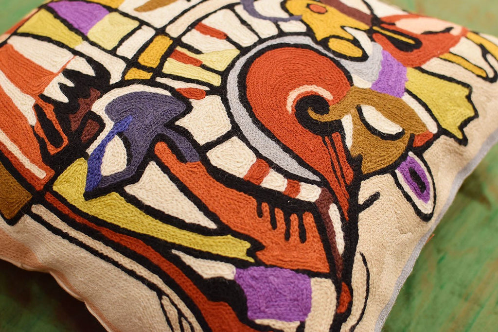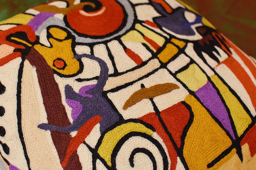 A close-up view of this abstract pillow cover allows you to see the amazing chain-stitch embroidery work of master artisans who have practiced this art their entire lives.Chain stitch embroidery on a cotton base produces a soft, fine crewel, and the stitches create definite swirls as distinct as your fingerprint. Kashmiri craftsmen produce the finest quality chain stitch needlework in the world.