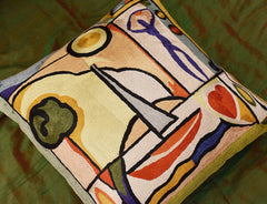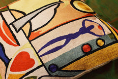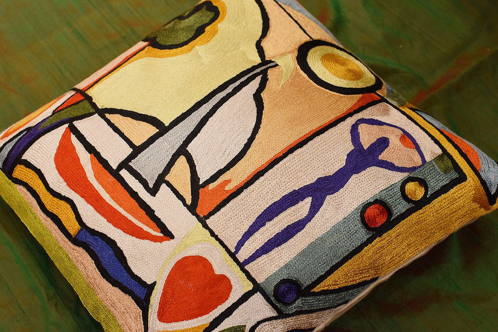 Kashmir is proud to bring together the modern abstract artwork pillow collection, inspired by world renowned artist Alfred Gockel and hand embroidered by the finest artisans of Kashmir, into the living spaces of patrons and connoisseurs‚ all around the world. These unique and modern pillows would bring the brighter elements of any room, creating a harmonious design and perfect air of sophistication. This decorative Cushion Cover Fun in the Sun II throw pillow cover has beautiful colors and design hand embroidered in lively and refreshing colors. Swirls of colorful chain stitch embroidery hand embroidered from soft Kashmir wool adds a dazzling sheen to the creation.