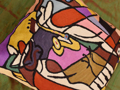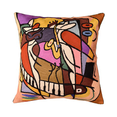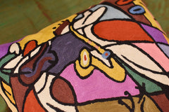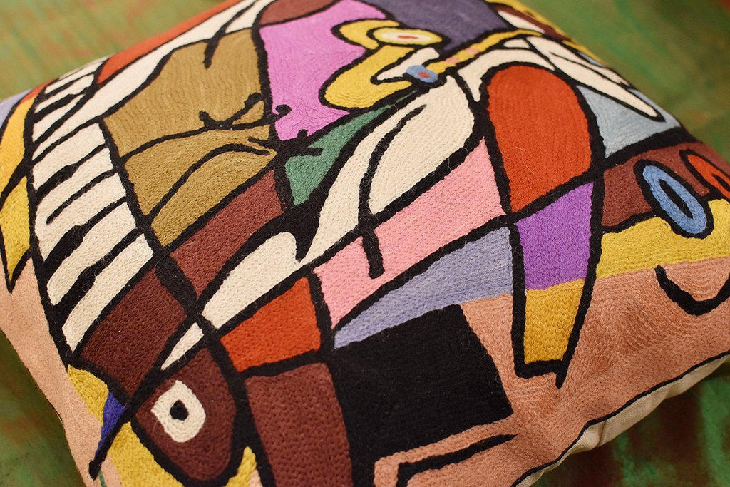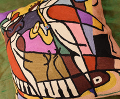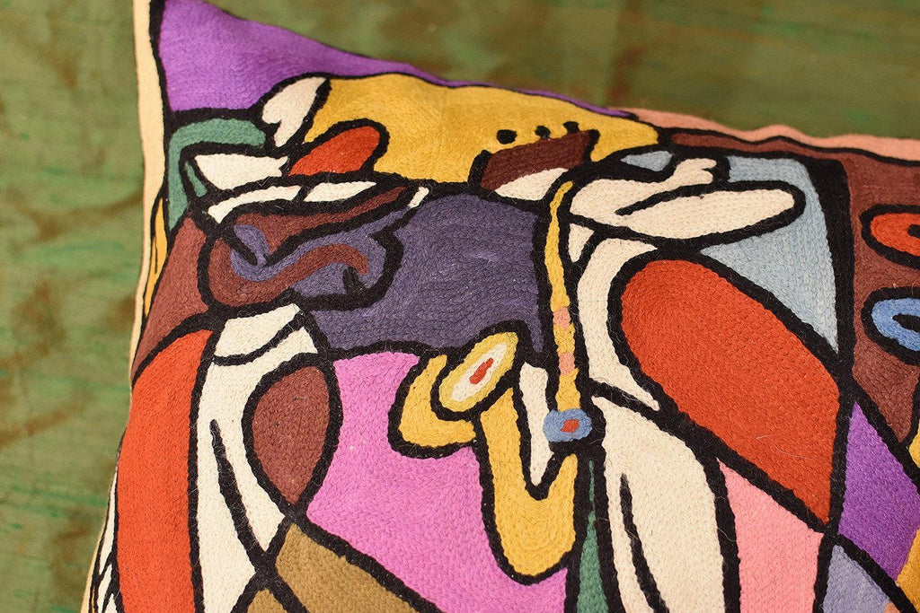 Kashmir is proud to bring together the modern abstract artwork pillow collection, inspired by world renowned artist Alfred Gockel and hand embroidered by the finest artisans of Kashmir, into the living spaces of patrons and connoisseurs‚ all around the world. These unique and modern pillows would bring the brighter elements of any room, creating a harmonious design and perfect air of sophistication. This decorative Cushion Cover Wailing on the Sax throw pillow cover has beautiful colors and design hand embroidered in lively and refreshing colors. Swirls of colorful chain stitch embroidery hand embroidered from soft Kashmir wool adds a dazzling sheen to the creation. The eye-popping color and pattern of this creation is just what the designer ordered to create a fiery focal point in your decor. This all-natural accent pillow cover makes an enduring impression.