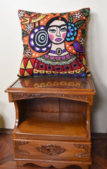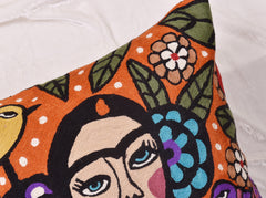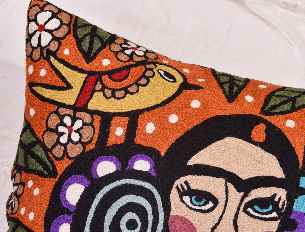 Frida Kahlo Inspired Pillow Cover Orange Mexican Art Pillowcase Eclectic Hispanic Throw Pillows Cushions Hand embroidered Wool Size - 18x18
