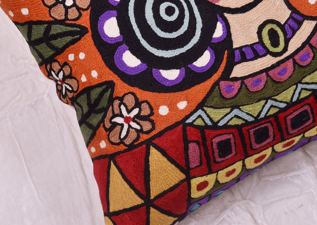 A close-up view of this abstract pillow cover allows you to see the amazing chain-stitch embroidery work of master artisans who have practiced this art their entire lives.This abstract decorative pillow cover could grace the cabin of your boat or the chair in your solarium and yet be equally as comfortable in your den.
