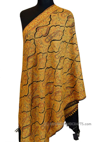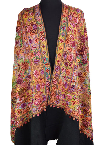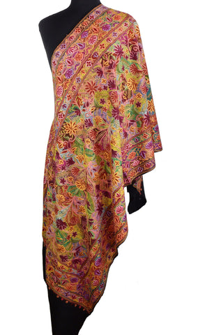 Kashmir embroidered shawls are world famous for their embroidery, beauty, texture a design. Opulence and mystique are the hallmark of hand embroidered Kashmir shawls. The elegance of this beautiful paisley design shawl is an epitome of class displayed by the lustrous natural sheen of hand embroidery. There is nothing like the experience of Jamawar. Luxury presents itself to the mind on many levels. You see it, you touch it, you feel it, you resonate with it. View additional pictures to see the intricate embroidery done in highly stylized beautiful patterns and superb craftsmanship unparalleled in the whole world. A luxurious jamawar shawl is sumptous, elegant - refined. Jamawar shawl conveys all that and more. There is nothing else on earth like a jamawar shawl - its an intense work because the embroidery covers the entire base fabric. Since these take several months to create, only the finest artisans attempt such a feat; they can produce one or two a year. Not only their art, but their very being goes into its creation. Embellished with hand-embroidered rich colors, with inspired creativity and impeccable craftsmanship, these shawls exude the royal elegance and regal decadence of the Victorian era and are perfect for all special occasions: weddings, formal dinners, garden parties, dances, etc. If you have a flair for fashion and dream to be timeless - dare to be unique and get a shawl that's a cut above the rest. The hand embroidery work is extremely fine and is done by the finest artisans of Kashmir. Each shawl is unique and no two are alike. Details of the Product: Size: 27 inch x 76 inch (Including Fringes) One-of-a-kind Shawl Fine Hand Embroidered Shawl Hand Dyed Shawl Unique Kashmir Embroidery Design Soft Kashmir Wool Product of Kashmir (India) Care for your Shawl: With proper care hand embroidered shawl will maintain its looks for a very long period of time and can be passed from one generation to another. Proper care will also increase its softness and luster. Here are some basic tips: For best results always hand-wash in very cold water with a mild non bleach detergent, a low pH shampoo, or use pure Castile soap. To dry, gently press out the excess water and hang over a shower curtain rod or lay it down on a flat surface. Always store your shawl outside the reach of bugs and store with it a few cinnamon cloves wrapped in muslin. Always keep it away from dampness and heat.