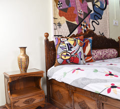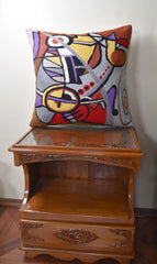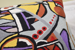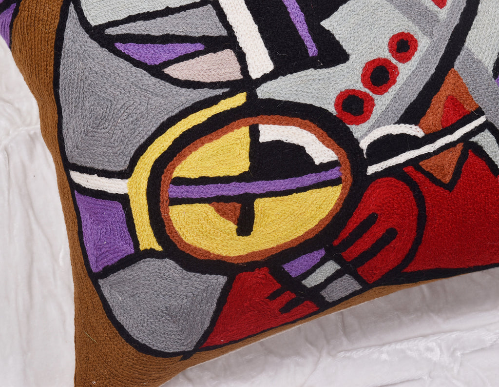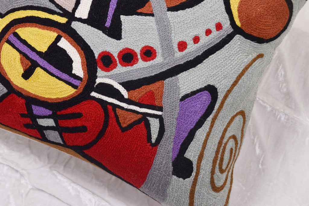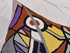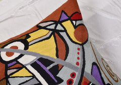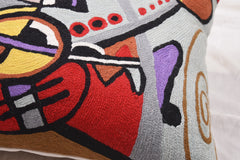 Decorative Pillow Cover Handembroidered - Star fragments and enigmatic hieroglyphs artfully stitched in this symphony pillow cover, finest Kashmir wool is used and chains titch needlework technique for embroidery. Cosmic colors like blue, lavender and silver complement earthier tones of terra cotta, harvest green and amber to recreate a design based on the work of influential Russian artist, Wassily Kandinsky.The exciting pattern evokes the thought of a ladder to the stars, a comet‚ s tail,or a star map. This cover could grace the cabin of your boat or the chair in your solarium and yet be equally as comfortable in your den. Durable and easy to clean, this toss pillow will catch the eye of every passerby.