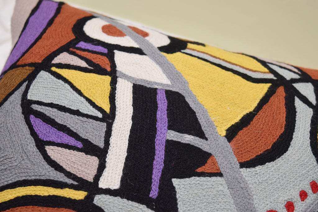 He crafted spiritually rich paintings that alluded to sounds and emotions through sensations. Modern Artist Wassily Kandinsky used the form of concentric circles to portray the soul. Rendered here as chain stitch embroidery in wool, this cushion cover can create a new personality for any room in which you choose to use it.
