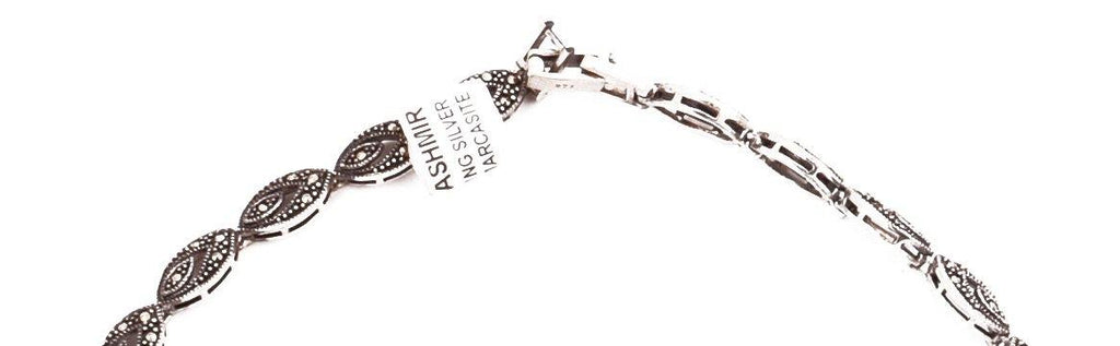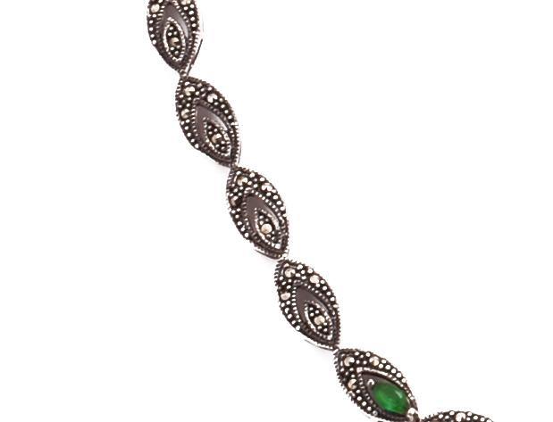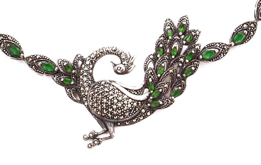 People who live from the heart usually are highly attracted to green. An alluring, true forest green Peacock necklace set in sterling silver and natural marcasite highlighting the whole necklace in a subtle way.