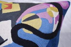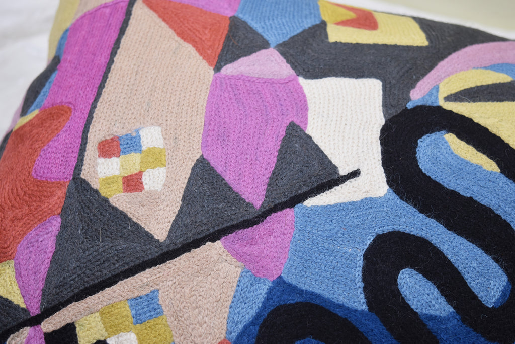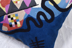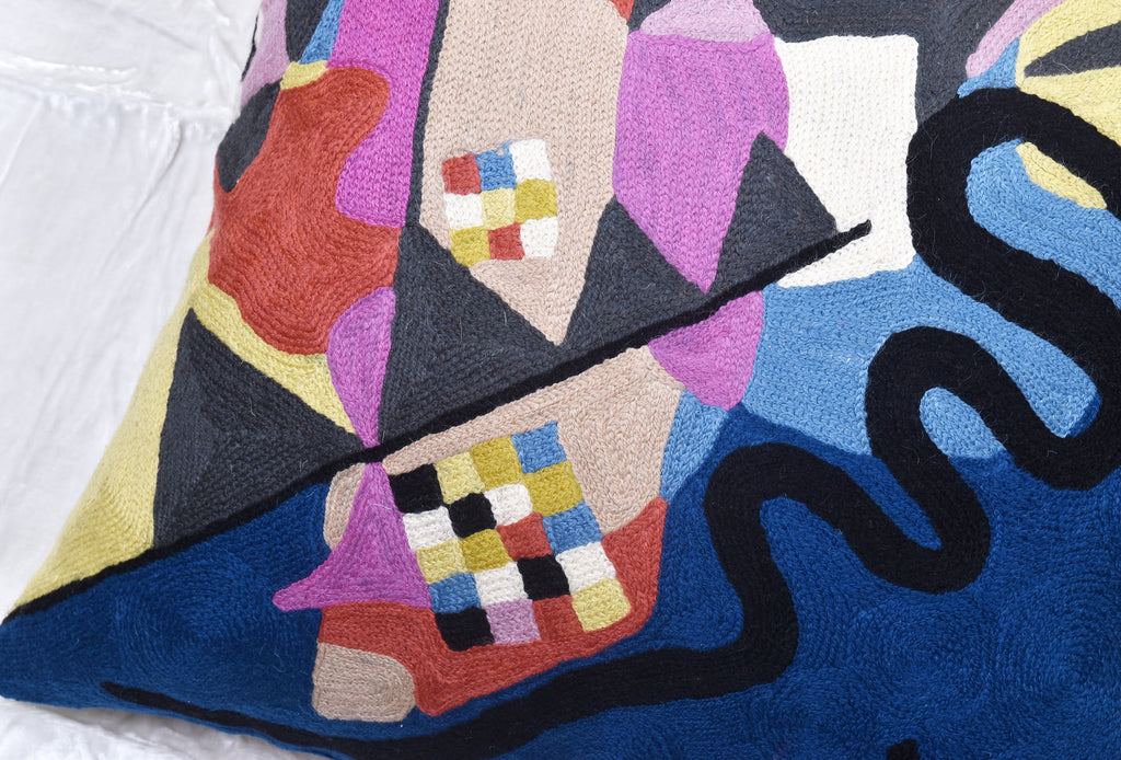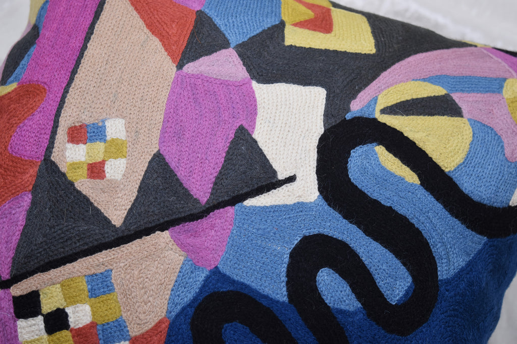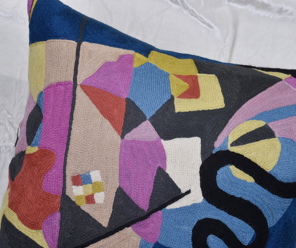 View additional pictures to see the intricate embroidery done in highly stylized beautiful patterns and superb craftsmanship unparalleled in the whole world. A close-up view of this abstract pillow cover allows you to see the amazing chain-stitch embroidery work of master artisans who have practiced this art their entire lives. This abstract decorative pillow cover could grace the cabin of your boat or the chair in your solarium and yet be equally as comfortable in your den. Kandinsky conveyed profound spirituality and inner human emotion through a visual language of abstract forms and colors that transcended cultural and physical boundaries. He used interrelation between color and form to create an aesthetic experience that engaged the sight, sound, and emotions of the viewer.