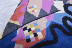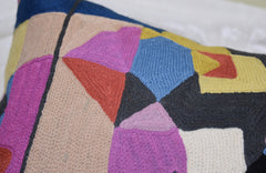 This modern decorative pillow cover is inspired by the artworks of Kandinsky. You can view the typical geometric forms in this colorful throw pillow cover which are more natural and free-flowing and are filled with rich colors of reds, blues, purple, and various hues of blues set on bright red background. Chain stitch embroidery on a cotton base produces a soft, fine crewel, and the stitches create definite swirls as distinct as your fingerprint. Kashmiri craftsmen produce the finest quality chain stitch needlework in the world.