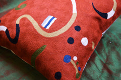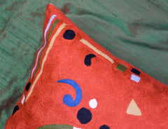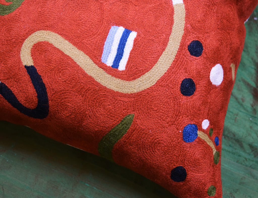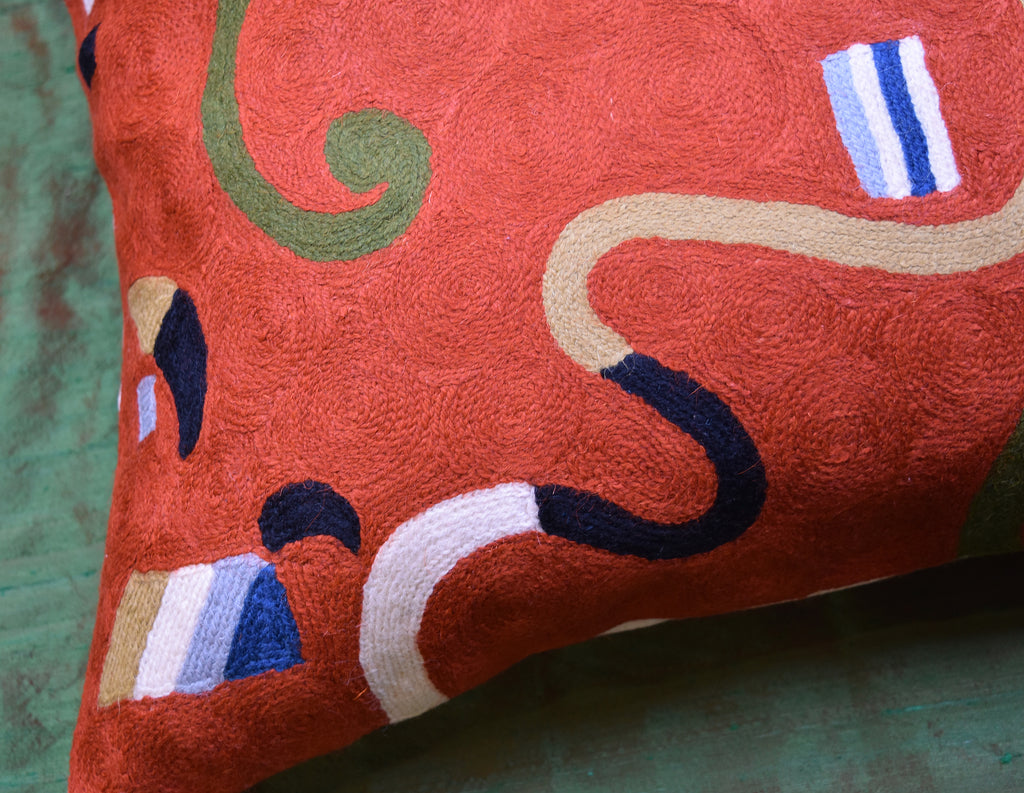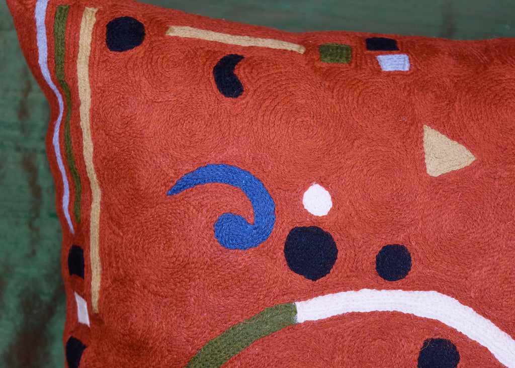 Deep orange hand-embroidered pillow cover creates a rich background for festive golden cords and confetti-like accents. Finely crafted Kashmir needlework, 100% wool worked into 100% cotton, is handmade into a durable and easy-to-care-for accent pillow cover. This work is the perfect fusion of 15th-century handcraft and 20th-century art to grace your 21st century home. Based on the work of influential Russian artist, Wassily Kandinsky, this singular design will stand out among other elements of decor.