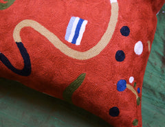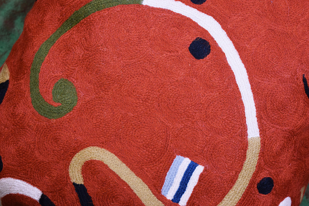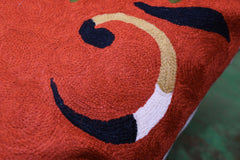 A close-up view of this abstract pillow cover allows you to see the amazing chain-stitch embroidery work of master artisans who have practiced this art their entire lives. This abstract decorative pillow cover could grace the cabin of your boat or the chair in your solarium and yet be equally as comfortable in your den. The eye-popping color and pattern of this modern throw pillow are just what the designer ordered to create a fiery focal point in your decor. Perfect wherever you need a splash of color, this artwork pillow creation is as durable as it is beautiful. Easy to care for, this cushion cover could spark up an old throw pillow or grace a new pillow form.