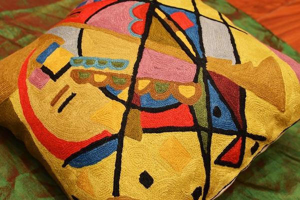 A close-up view of this abstract pillow cover allows you to see the amazing chain-stitch embroidery work of master artisans who have practiced this art their entire lives.This abstract decorative pillow cover could grace the cabin of your boat or the chair in your solarium and yet be equally as comfortable in your den.