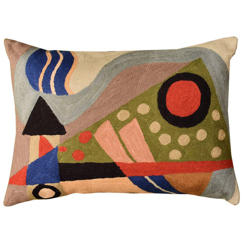 Kandinsky viewed music as the most transcendent form of non-objective art – musicians could evoke images in listeners’ minds merely with sounds. He crafted spiritually rich paintings that alluded to sounds and emotions through sensations. Modern Artist Wassily Kandinsky used the form of concentric circles to portray the soul. Rendered here as chain stitch embroidery in art silk, this cushion cover can create a new personality for any room in which you choose to use it.