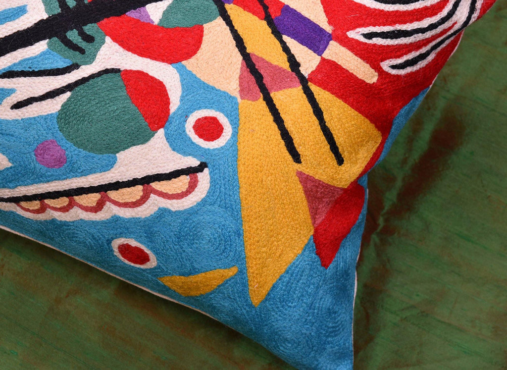 This modern hand embroidered pillow cover is designed knowing that Kandinsky portrayed the soul as concentric circles, we see in this pillow cover, perhaps the eye of the soul or seeds and ovum. Gorgeous and Bold color swathes are seen in this cushion cover, a fusion of the hand-dyed Kashmiri wool and the expert needlework. The hand worked modern pillow cover is of the finest chainstitch, the stitch of an accomplished artisan, finer than crewel. The kaleidoscopic design deserves to be seen and experienced. This cover will be an attention-getter no matter where you put it.