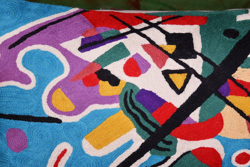 A close-up view of this abstract pillow cover allows you to see the amazing chain-stitch embroidery work of master artisans who have practiced this art their entire lives.This abstract decorative pillow cover could grace the cabin of your boat or the chair in your solarium and yet be equally as comfortable in your den.