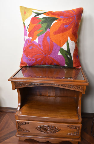 A close-up view of this abstract pillow cover allows you to see the amazing chain-stitch embroidery work of master artisans who have practiced this art their entire lives.This abstract decorative pillow cover could grace the cabin of your boat or the chair in your solarium and yet be equally as comfortable in your den.